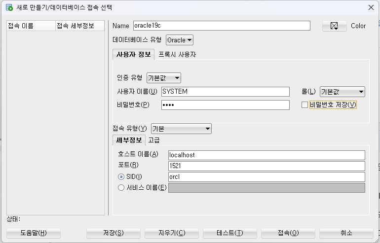 2-2. name, 사용자 이름,비밀번호(oracle19c 설치 시 입력 했던 비밀번호),