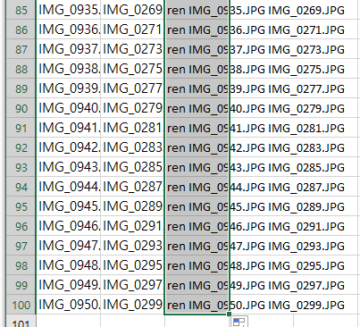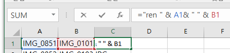 ="ren " & A1& " " & B1 마찬가지로 첫 행 입력후 모서리에 마우스를 갖다대어 + 커서로 변경 됐으면